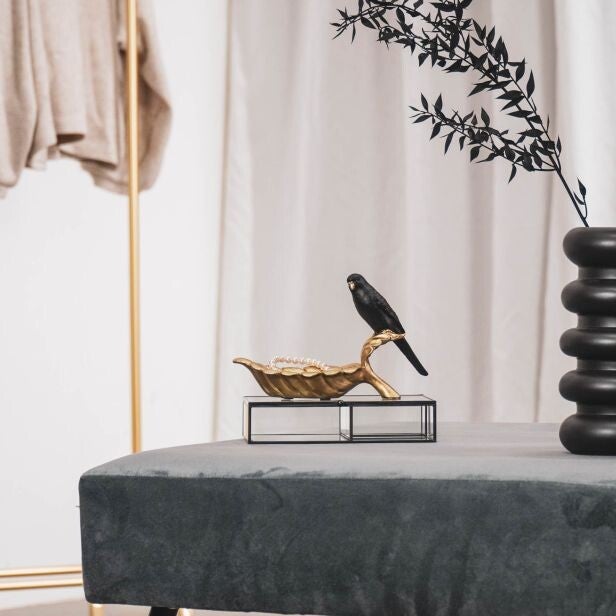 Stijlvol gouden schaaltje met zwarte parkiet vogel