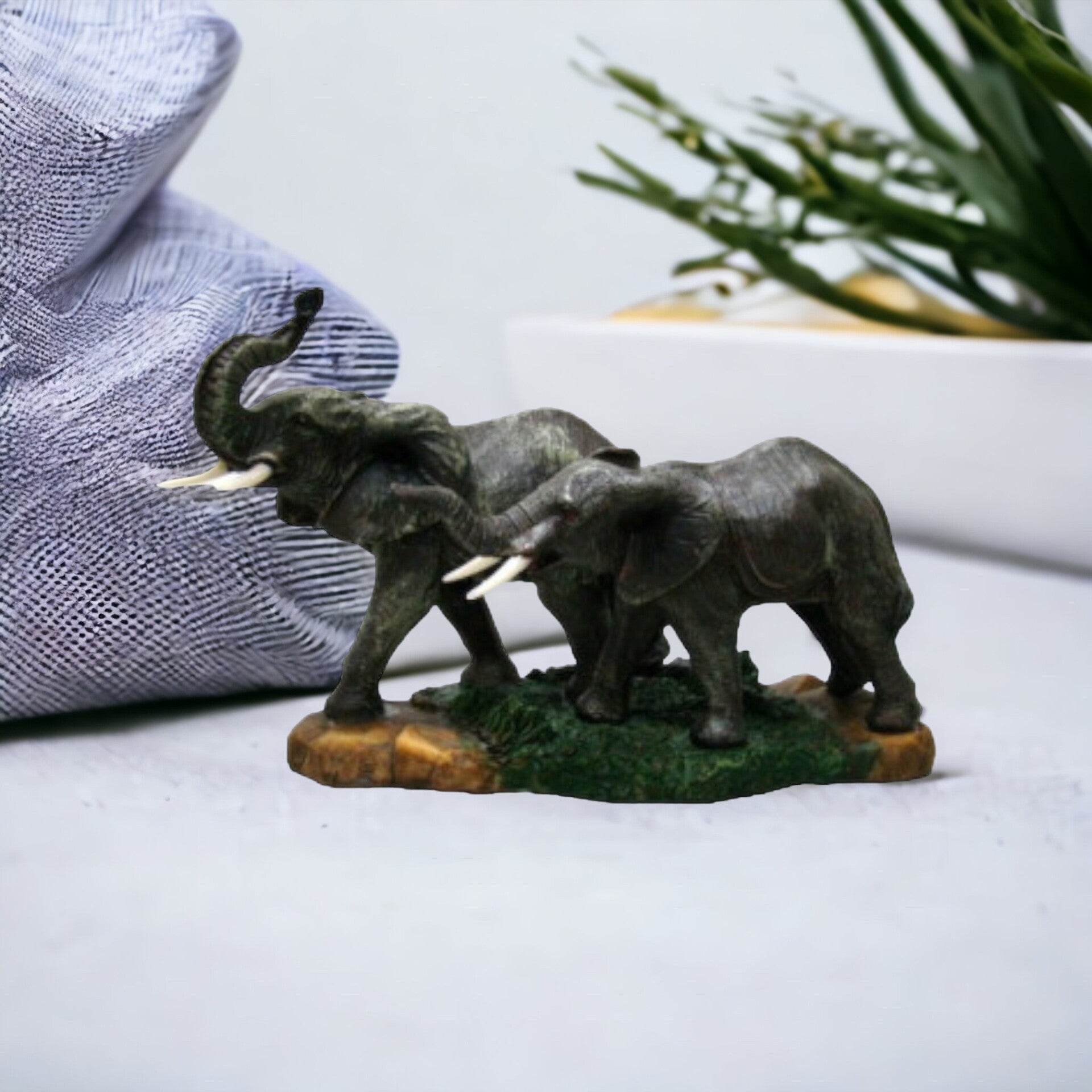 Geef jouw interieur een dierenaccent met dit mooie decoratieve beeld van twee staande olifanten met imposante slagtanden. Dit olifantenbeeld is fraai van detail en komt levensecht over.
