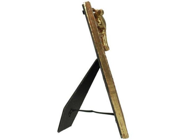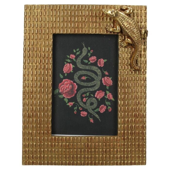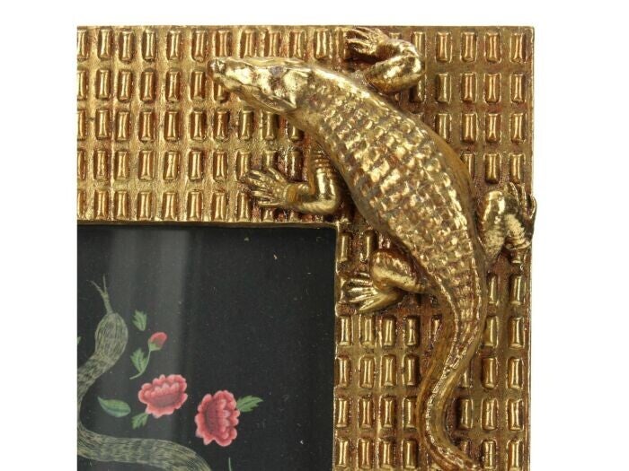 Breng een extra persoonlijke touch aan in jouw interieur met deze stijlvolle fotolijs. De fotolijst is geschikt voor foto's met een formaat van 10 cm x 15 cm. De rand van de lijst is fraai gedetailleerd in een mooie goudkleur met een krokodil erop. De fotolijst is staand te gebruiken en je kunt hem ook ophangen. Jouw meest dierbare foto komt helemaal tot zijn recht in dit fotolijstje. En heb je even geen geschikte foto voor in het fotolijstje? Geen probleem, want op de achtergrond is een schitterende slang te zien.