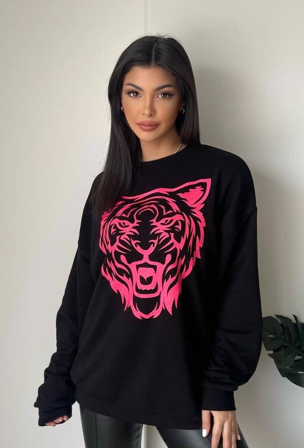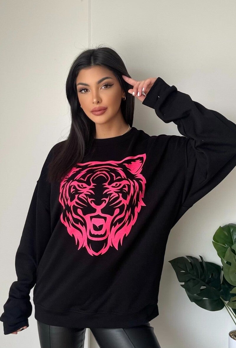 Maak een stijlvol statement met deze gave zwarte sweater met een opvallende neon roze tijgerkop print! Deze trendy en comfortabele trui is perfect voor een stoere, modieuze look en geeft elke outfit een krachtige en speelse uitstraling.