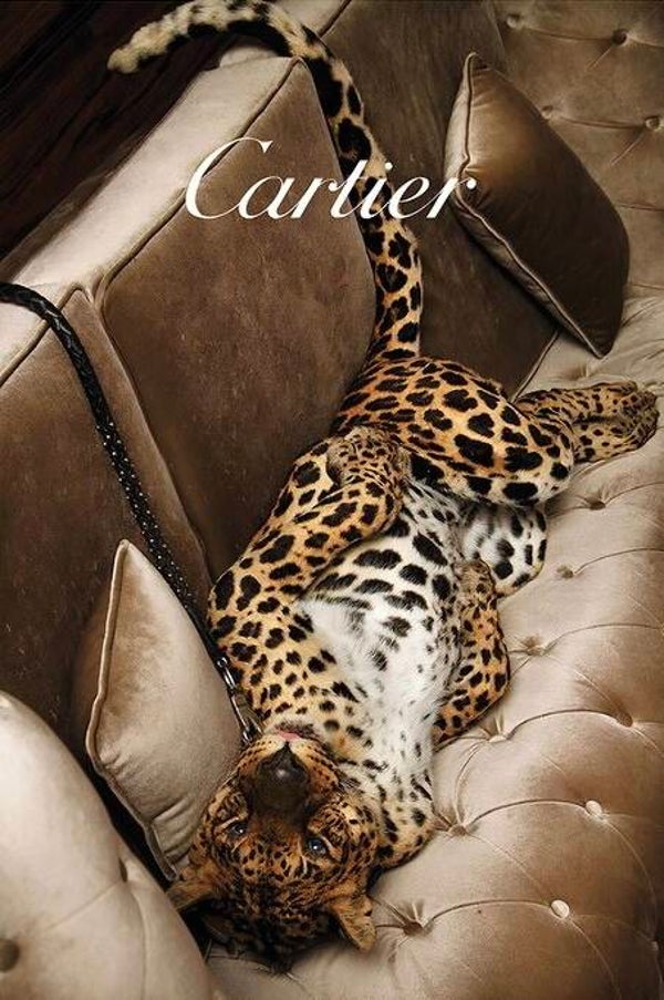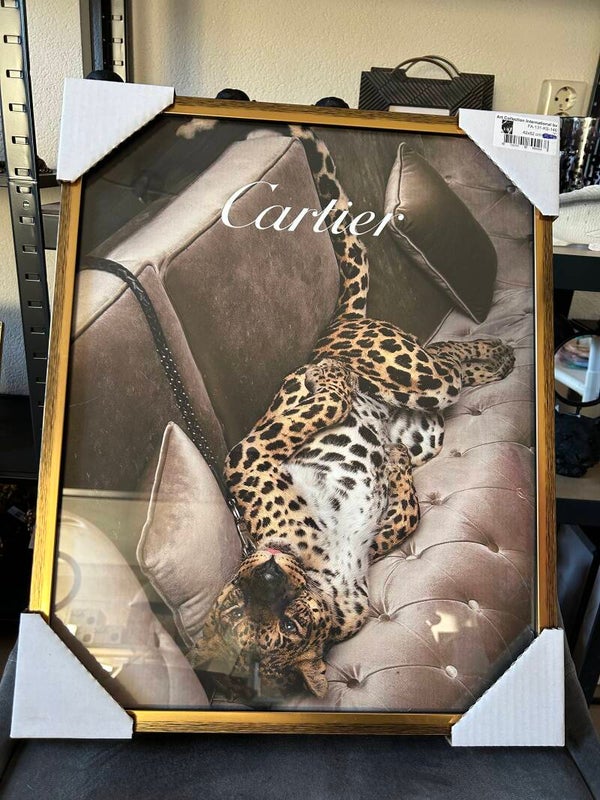 De iconische afbeelding, afkomstig uit een modecampagne van Cartier, toont een ontspannen luipaard op een elegante leren bank. Dit kunstwerk straalt klasse, rust en verfijning uit en voegt een vleugje exclusieve luxe toe aan je woonruimte.