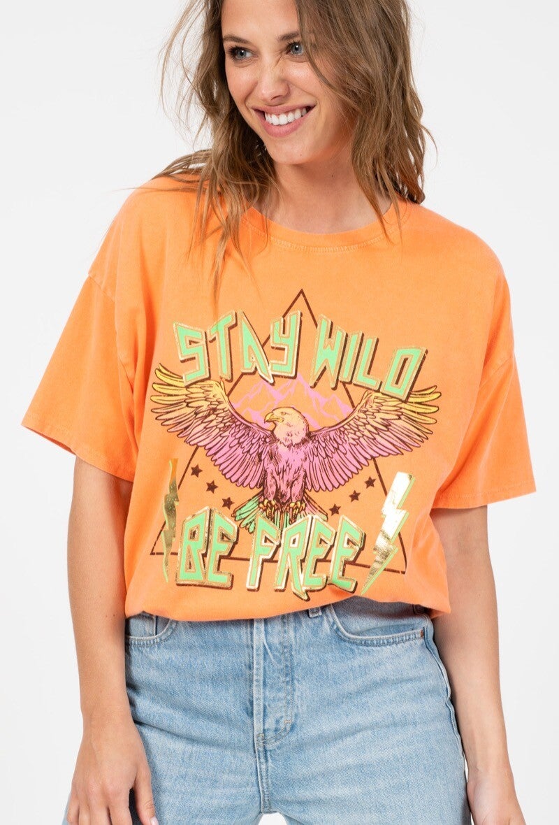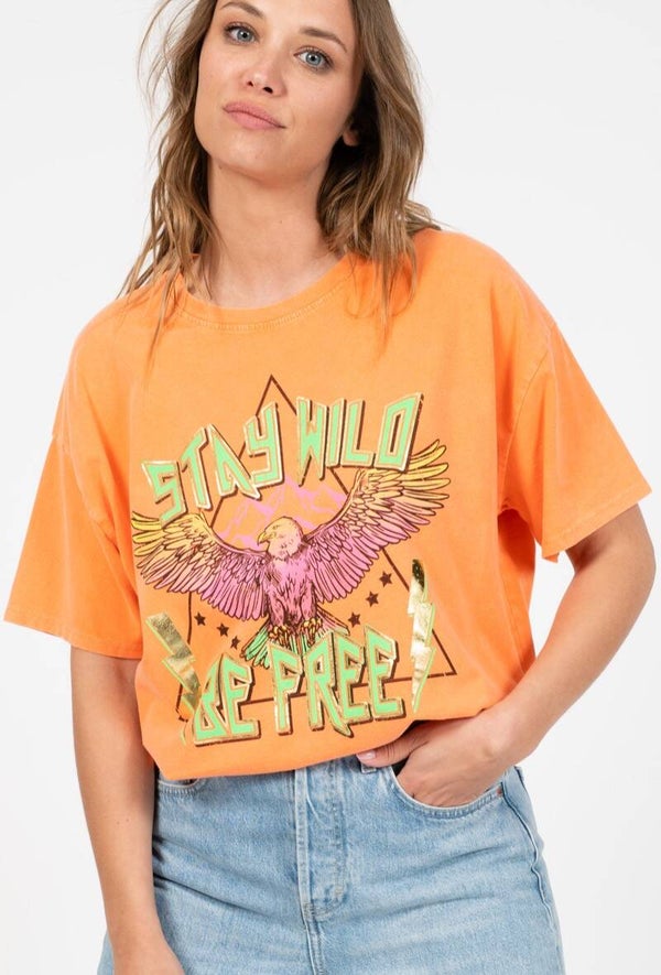 Nieuw in onze collectie is dit gave oranje t-shirt met een mooie adelaar. Het t-shirt is vintage washed in de kleur oranje en heeft een opdruk van een adelaar en de teksten "Stay Wild" en "Be Free".