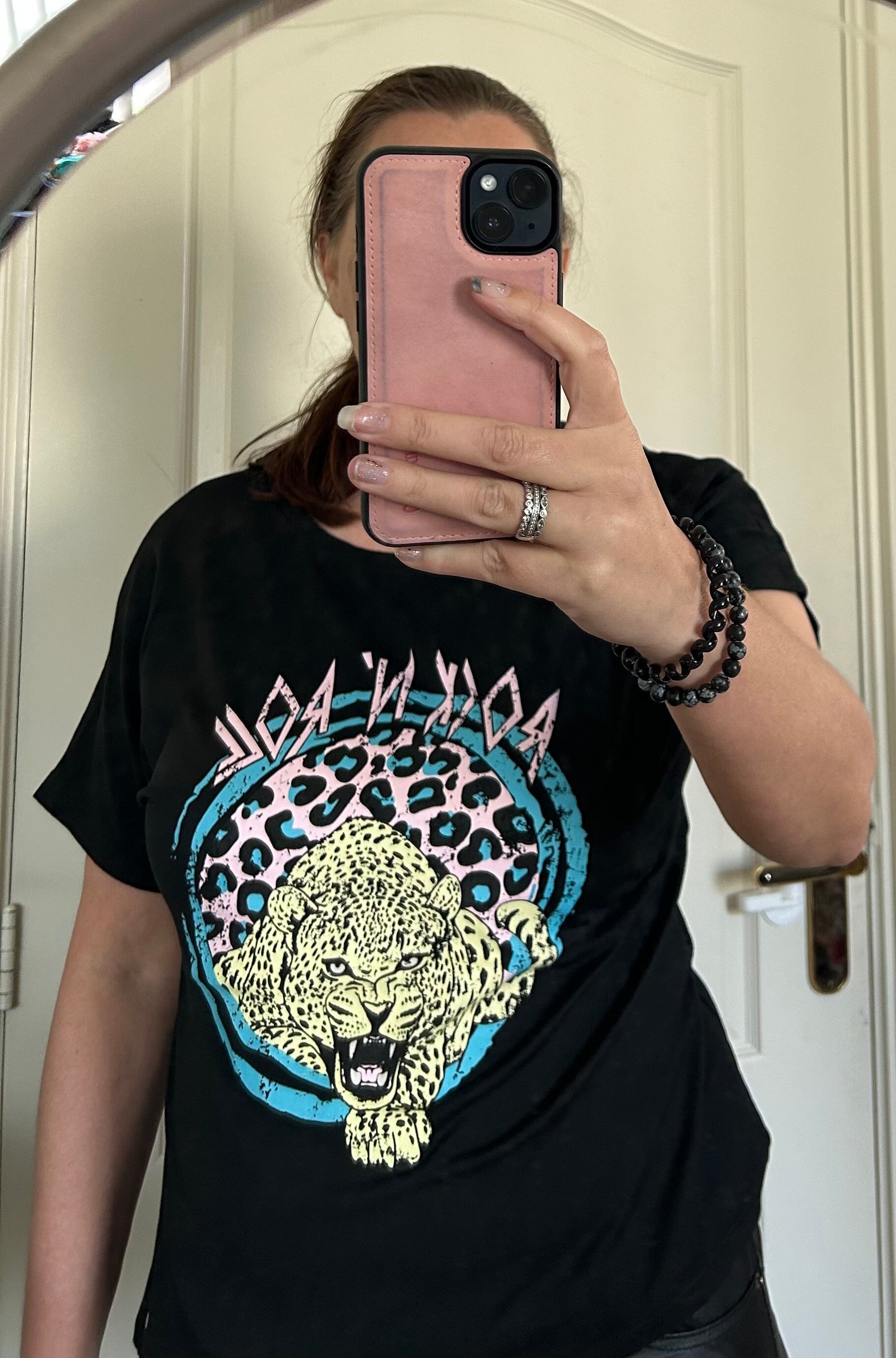 Mooi onesize t-shirt met panter in zwart met blauw