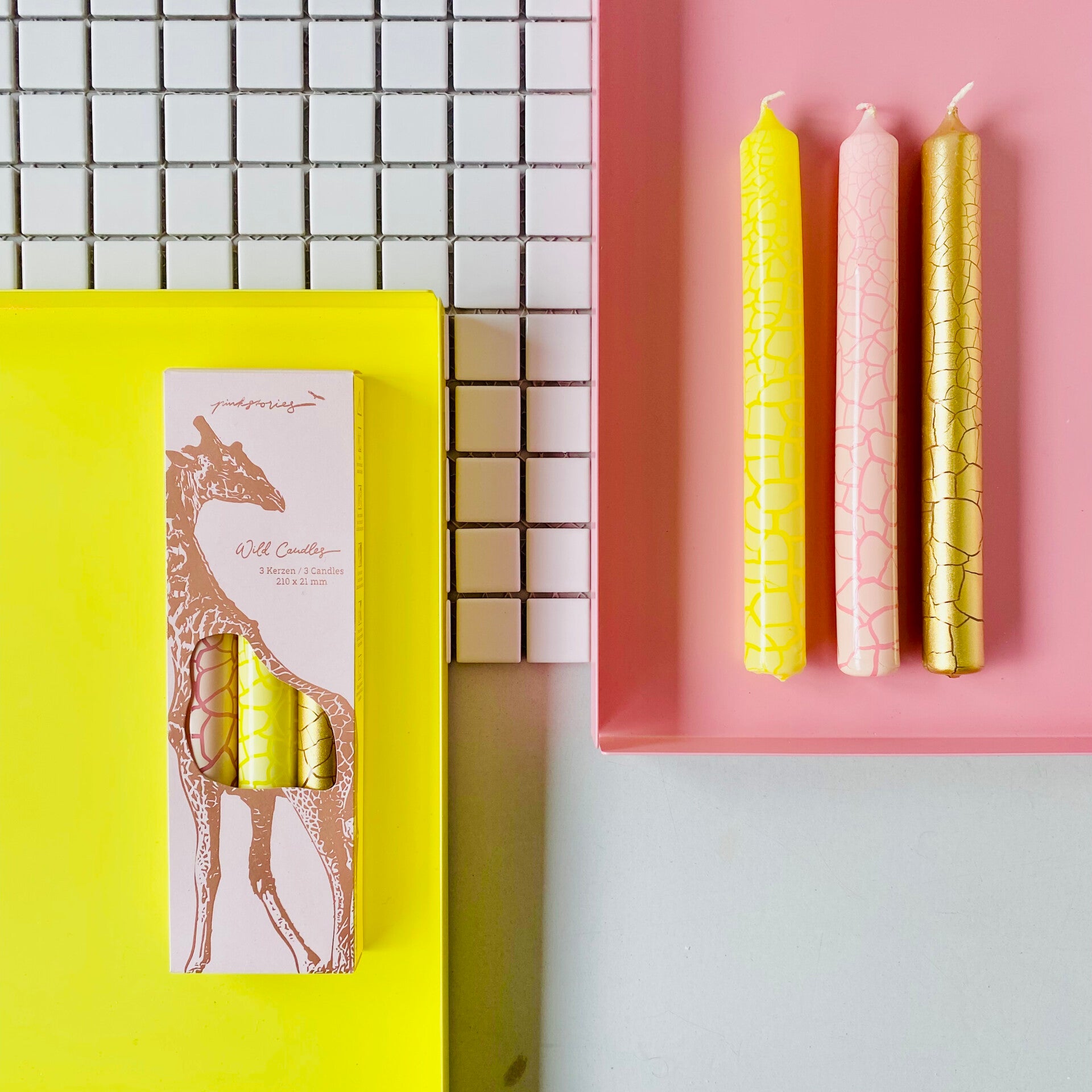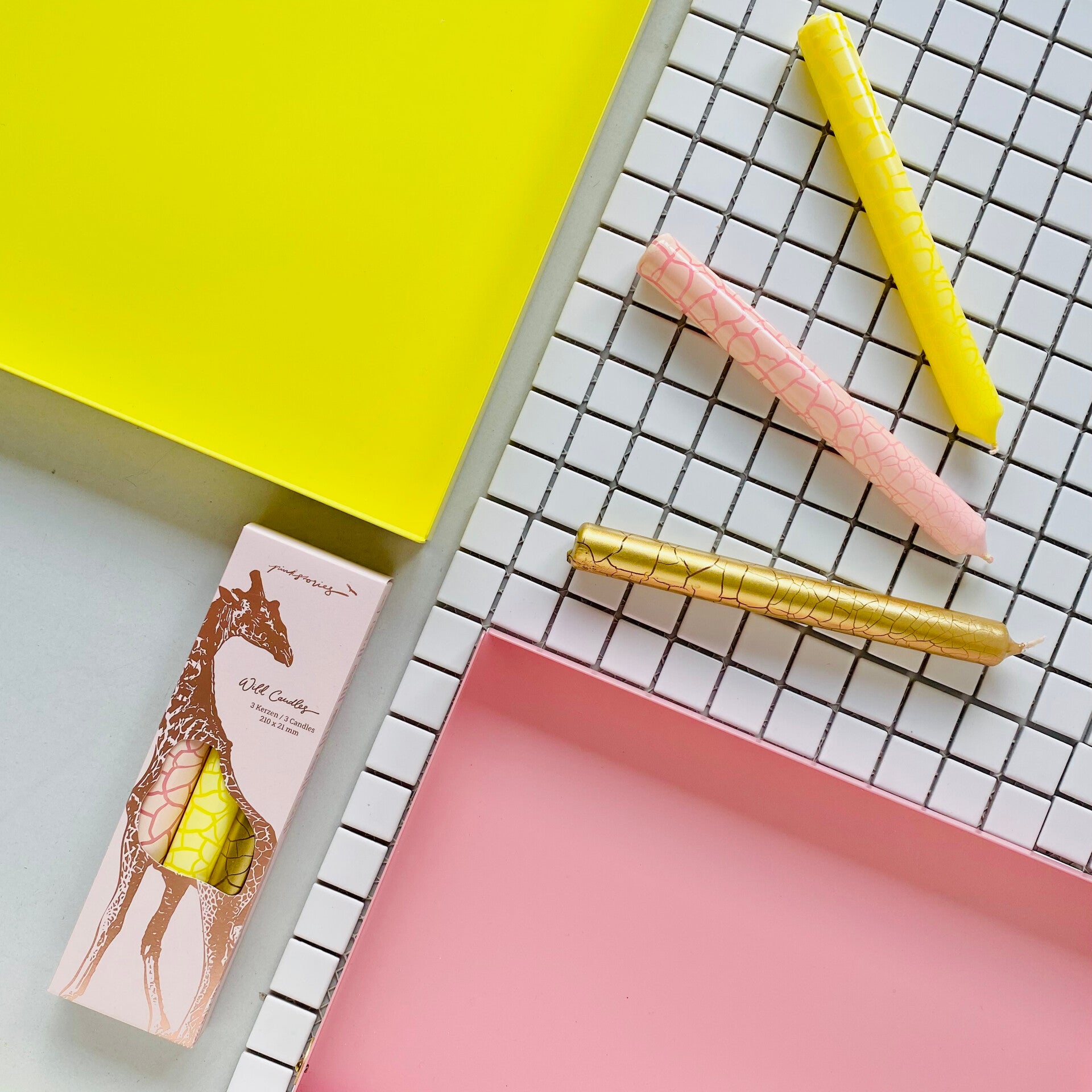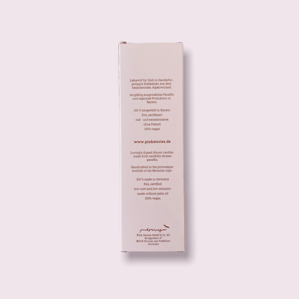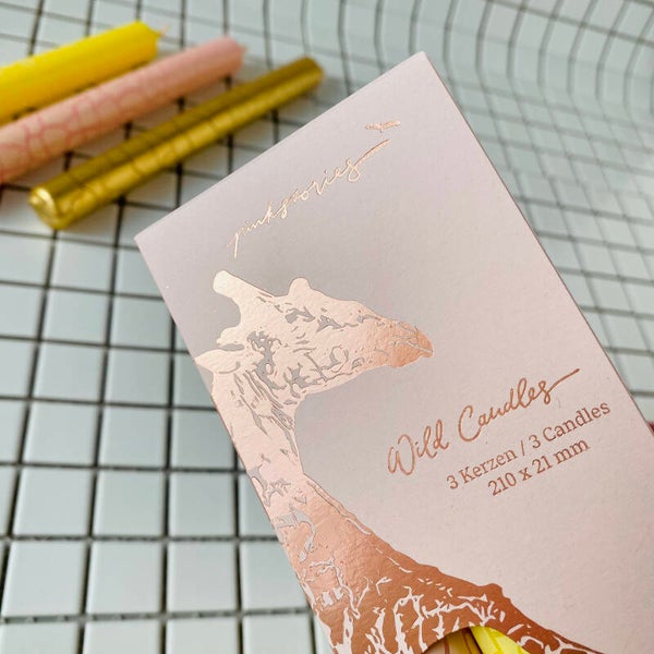 De giraffeprint in roze, geel en goud geeft een stijlvolle en speelse uitstraling, perfect voor een chique diner, gezellige avond of als decoratief accent in je interieur. Deze kaarsen worden lokaal geproduceerd in Beieren en zijn gemaakt van zorgvuldig geselecteerde paraffine zonder palmolie, waardoor ze duurzaam, veganistisch en milieuvriendelijk zijn.