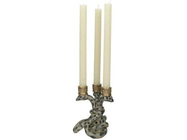 Deze artistieke kandelaar in de vorm van 3 slangen brengt een extra accent aan in jouw interieur. De voet van deze kandelaar is gevormd door 3 slangen waarbij hun koppen elk een kaarsenhouder omhoog houden. Het is een waar kunstvoorwerp en een echte eyecatcher voor bijvoorbeeld in de woonkamer of in de hal. De kandelaar kent fijne uitgewerkte details van de slangen. Met deze kandelaar breng je gegarandeerd sfeer in huis.