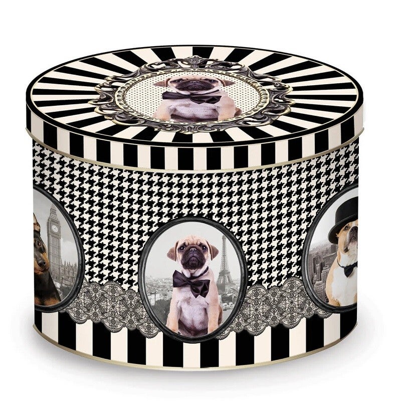 Supergaaf tinnen blik in Barok stijl met erin een porseleinen mok in Barok stijl, beiden met als thema honden.
