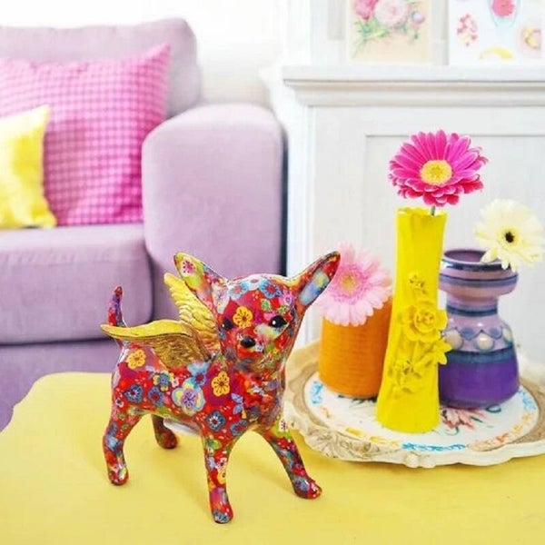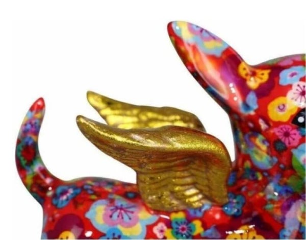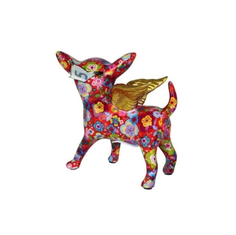 Supermooie, vrolijk gekleurde spaarpot van het merk Pomme Pidou. Dit is de Chihuahua Angel Nanou met gave bloemetjes patroon met rode achtergrondkleur. Deze heet: Its Raining In Paris.