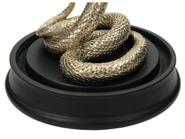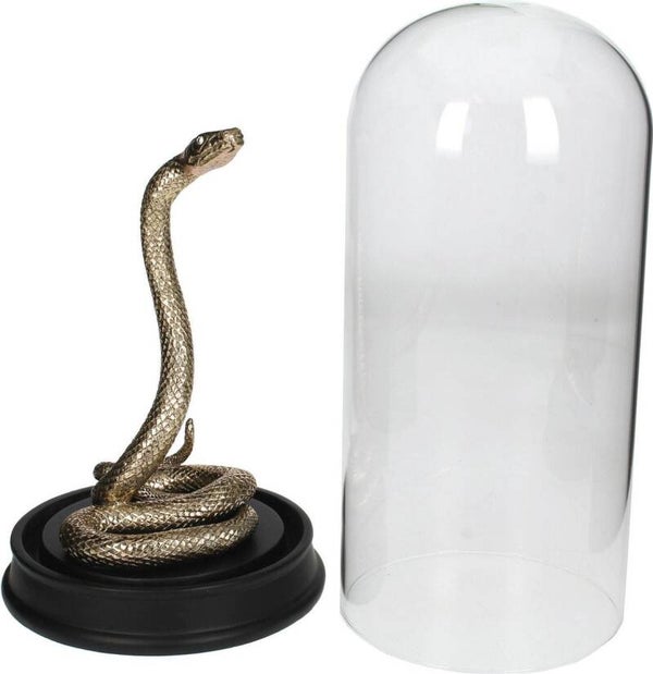 Deze mooie glazen stolp met een gouden slang erin is een pronkstuk in huis en past perfect als woonaccessoire in elk interieur. De slang is prachtig vormgegeven met mooie details en met een sprekende gouden kleur. Het kronkelige lijf van de slang rust op een elegante zwarte voet. De kop van de slang zoekt onder de stolp naar een uitgang om te ontsnappen. Gelukkig houdt de mooie glazen stolp de slang tegen. Deze stolp met slang is als woondecoratie voor in huis een absolute aanwinst. Zet de stolp met slang bijvoorbeeld op een bijzettafeltje, in een open kast, op de vensterbank of op de schouw. volop mogelijkheden!