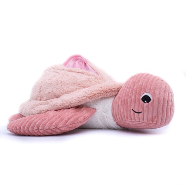 Deze mooie roze schildpad knuffel van het merk Les Déglingos is werkelijk prachtig qua uitvoering en ook nog eens heerlijk zacht om mee te knuffelen. Het is een grote mama schildpad met op haar rug een baby schildpadje. De baby schildpad kun je loshalen van de mama schildpad en je kunt zelfs iets verstoppen of bewaren in de rug van het baby schildpadje. De binnenkant van de schildpadden is gemaakt van gerecycled polyester, dus ook nog eens milieuvriendelijk.