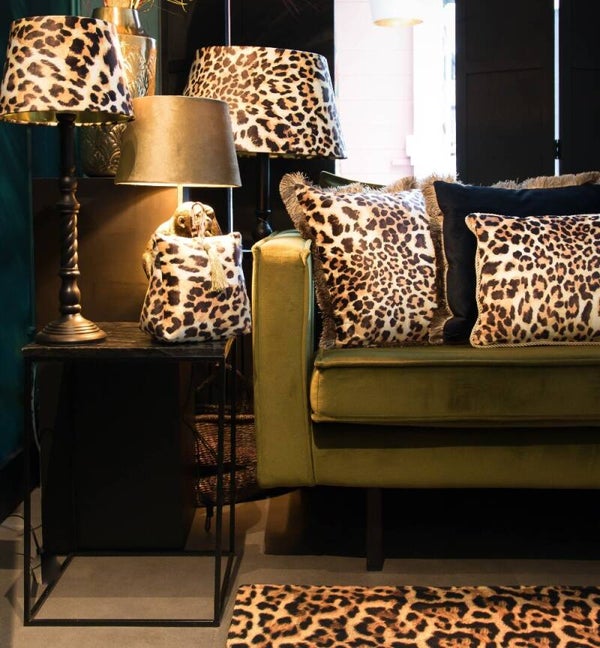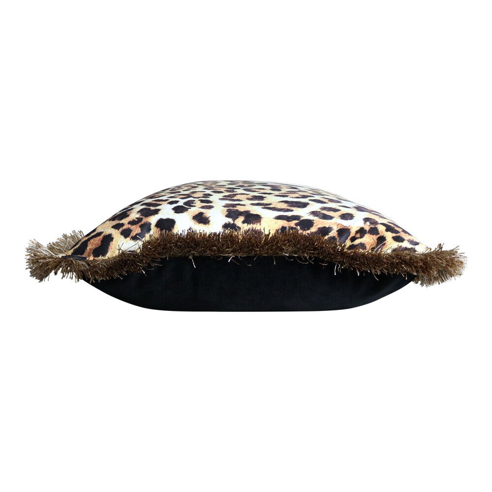 Dit schitterende kussen is voorzien van een print van een luipaardvacht. Het kussen is verder fraai van kleur met prachtige bruin-beige tinten en fraaie franjes aan de zijkanten. De mooie print en de heldere kleuren zorgen voor prachtige accenten in jouw interieur. Je kan de kussens gebruiken voor op de bank of als decoratie in bijvoorbeeld een erker. Volop mogelijkheden. We hebben in dezelfde stijl met luipaardprint ook ronde zitkussens.