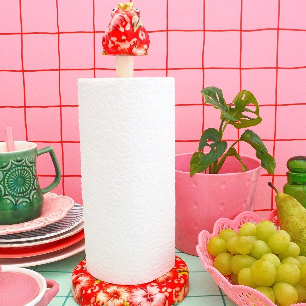 Gemorst? Geen probleem. Met deze vrolijke keukenrolhouder 'Kikker Freddy' met mooie bloemenprint is schoonmaken een feest. Telkens als je de keukenrol nodig hebt, kijkt Freddy je aan en krijg je vanzelf een lach op jouw gezicht. De keukenrolhouder is mooi gedecoreerd met een rode bloemenprint. En zoals we kennen van het merk Pomme-Pidou zijn ze handgeschilderd en dus uniek. Een pareltje voor in de keuken!