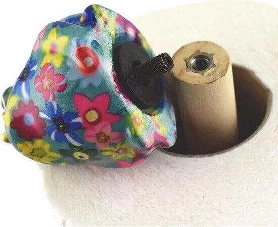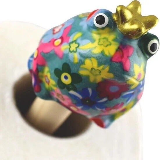 Gemorst? Geen probleem. Met deze vrolijke keukenrolhouder 'Kikker Freddy' met mooie bloemenprint is schoonmaken een feest. Telkens als je de keukenrol nodig hebt, kijkt Freddy je aan en krijg je vanzelf een lach op jouw gezicht. De keukenrolhouder is mooi gedecoreerd met een blauwe bloemenprint. En zoals we kennen van het merk Pomme-Pidou zijn ze handgeschilderd en dus uniek. Een pareltje voor in de keuken!