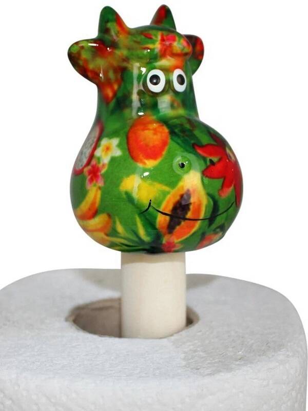 Vrolijke keukenrolhouder Koe Bella in groen met tropisch fruit