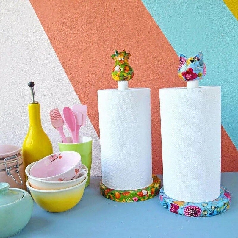 Gemorst? Geen probleem. Met deze vrolijke keukenrolhouder 'Koe Bella' met een mooie groene print met tropisch fruit is schoonmaken een feest. Telkens als je de keukenrol nodig hebt, kijkt Bella je aan en krijg je vanzelf een lach op jouw gezicht. De keukenrolhouder is mooi gedecoreerd met een print van tropisch fruit (Copa Cabana Green). En zoals we kennen van het merk Pomme Pidou zijn ze handgeschilderd en dus uniek. Een pareltje voor in de keuken!