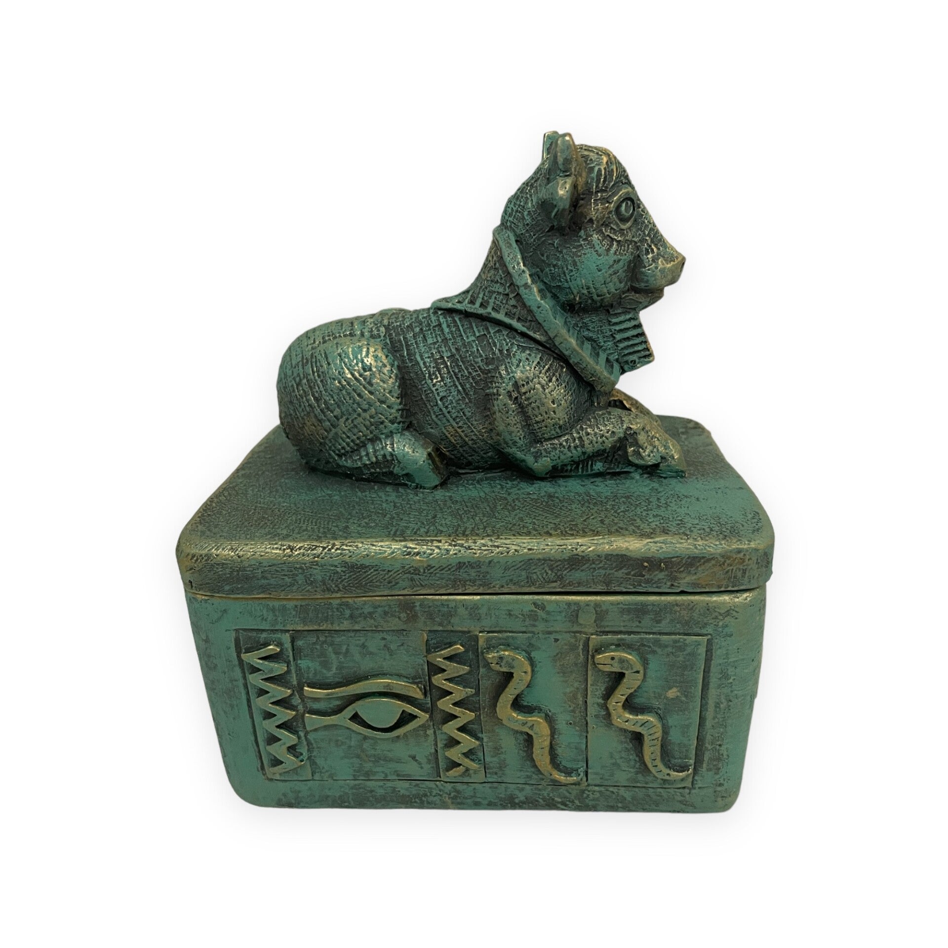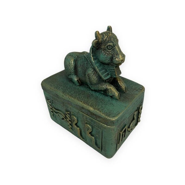 Ben je op zoek naar iets speciaals? Dan is dit prachtig opbergdoosje in oudheid stijl met deksel met daarop een liggende koe een echte aanrader. In het oude Egypte was de koe een belangrijk dier. De koe werd als symbool gebruikt voor de hemel. Deze liggende koe op het doosje beschermt jouw eigendommen in het doosje. In het doosje kun je uiteenlopende dingen in bewaren zoals sieraden, munten maar ook bijvoorbeeld sleutels. Ook de prachtige goud-groene kleur van het opbergdoosje is een veel gebruikte en kenmerkende kleur voor het oude Egypte. Daarnaast is het doosje en het deksel rijk versierd met dieren en figuren van het oude Egypte zoals konijn en slang.