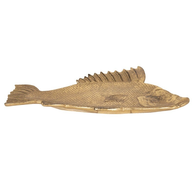 Voeg een vleugje luxe toe aan je interieur met deze decoratieve schaal in de vorm van een vis. De prachtige goudkleurige afwerking en het gedetailleerde ontwerp maken deze schaal een echte blikvanger in elke ruimte. Gebruik hem als stijlvol decoratiestuk, als kaarsenplateau, of om kleine accessoires op een chique manier te presenteren.