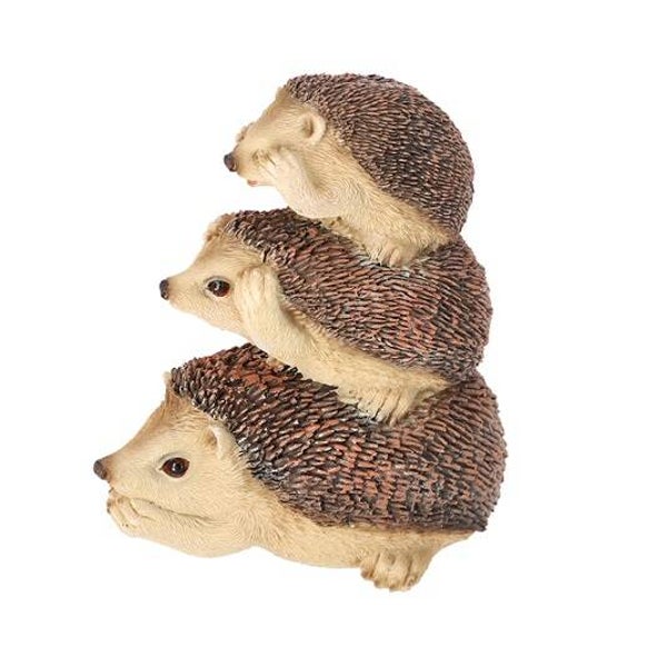 Altijd een glimlach bij het zien van dit leuke beeldje van egels op elkaar 'Horen, zien en zwijgen'. Egels zijn sowieso aandoenlijke bosdieren en deze egeltjes zijn levensecht gemaakt. De egels zijn voorzien van mooie details zoals de vacht met stekeltjes en de pretoogjes van de egels. Dit decoratieve beeldje is geschikt voor binnen en buiten.