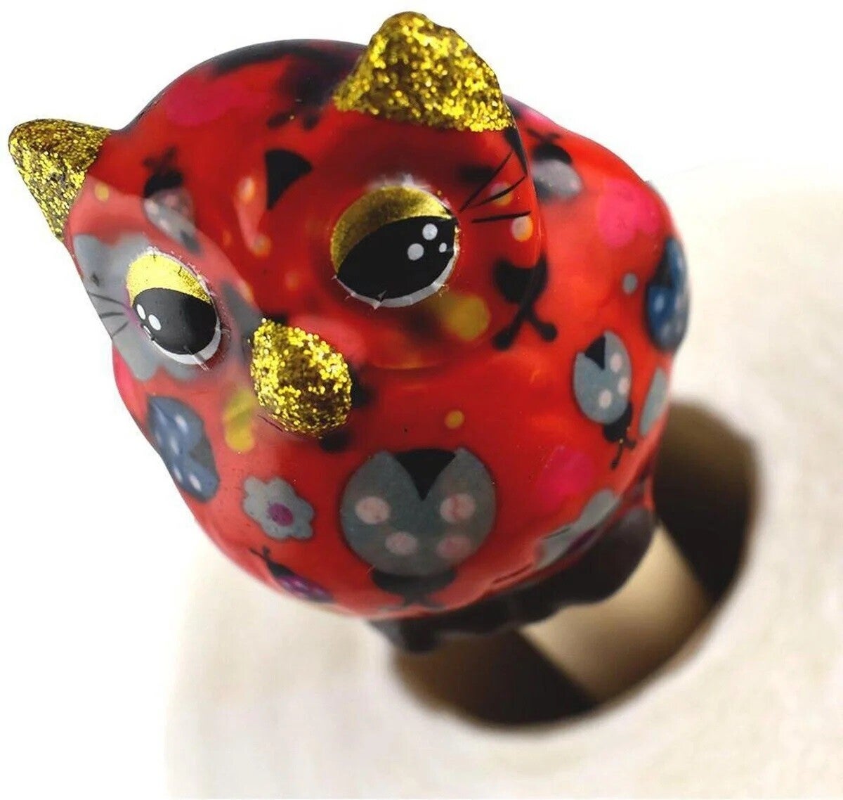 Keukenrolhouder uil Olive in rood met lieveheersbeestjes, bloemetjes en hartjes (coccinelle Rubyred)