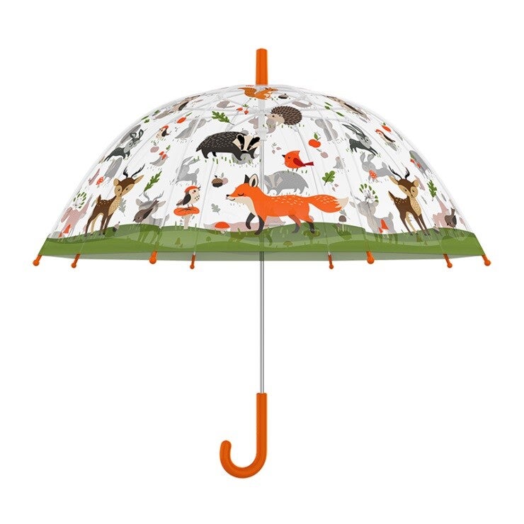 Laat je kind droog en vrolijk door de regen wandelen met deze schattige transparante kinderparaplu! De doorzichtige kap is versierd met een gezellige print van bosdieren, waaronder een hert, vos, das, konijn en diverse vogels.