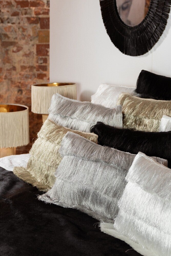 Breng extra sfeer en luxe in huis met dit prachtige kussen met franjes in een gouden kleur. Dit fluweelzachte kussen straalt pure hotel chique elegantie uit en vormt een perfecte match met dierenkandelaars, kussens met dierenprints en stijlvolle gouden, zilveren en zwarte dierenbeelden.