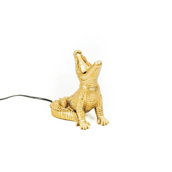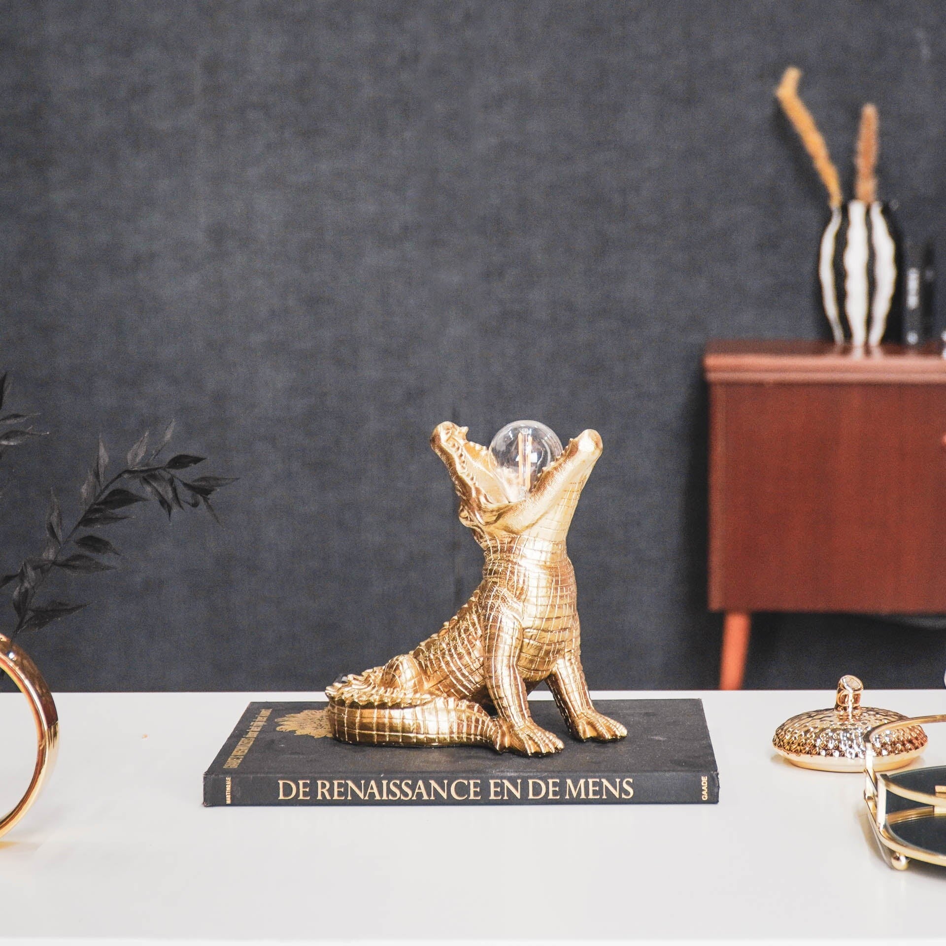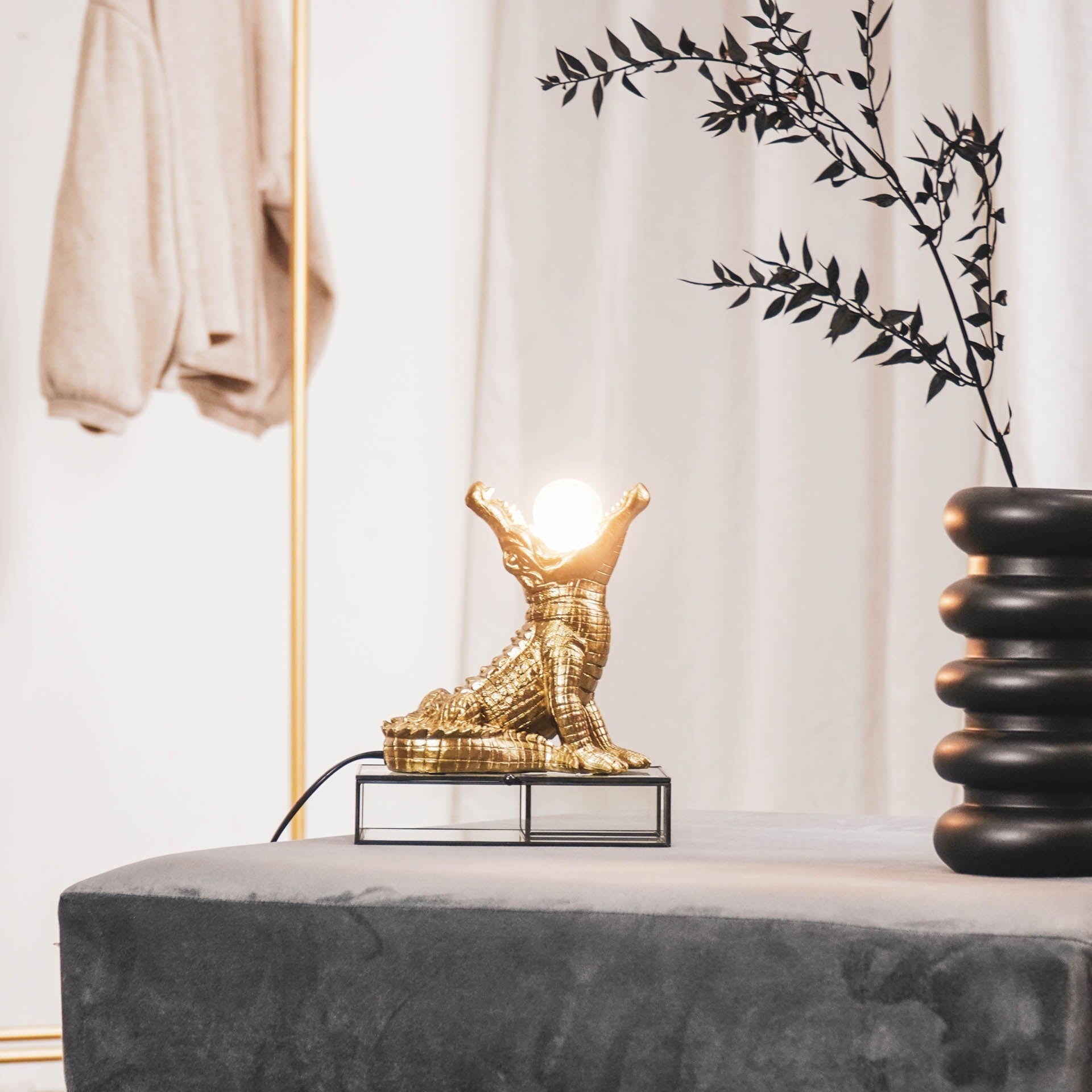 Deze gouden krokodillenlamp is niet alleen een functionele lichtbron, maar ook een stoere en chique woonaccessoire.