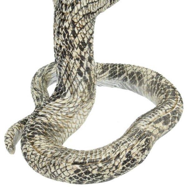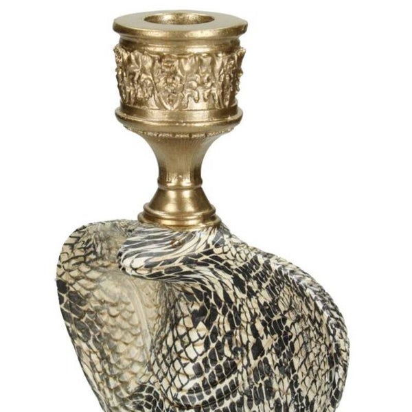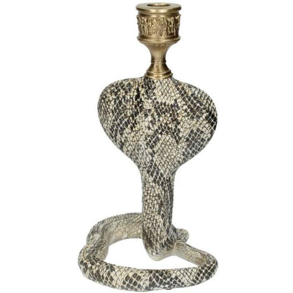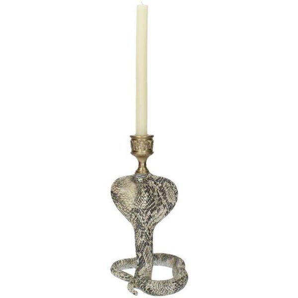 De cobra slang is al eeuwenoud een fascinerend dier. En gelukkig hoef je geen slangenbezweerder te zijn om deze prachtige kandelaar slang grijs rechtop te zien. Met de kenmerkende uitgezette halsribben van de cobra slang draagt deze slang de kaarshouder met verve. De grijze kleur van de kandelaar slang zorgt voor een authentieke uitstraling dat in elk interieur een mooi plekje verdient. Mooi detail is de prachtige gouden kaarshouder op de kop van de slang. Deze tijdloze kandelaar slang is een mooie woonaccessoire en past bij iedere woonstijl en komt het best tot zijn recht op een dressoirkast, een bijzettafeltje, de vensterbank of op de schouw.