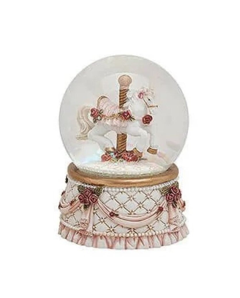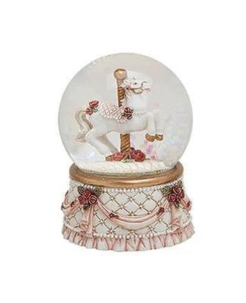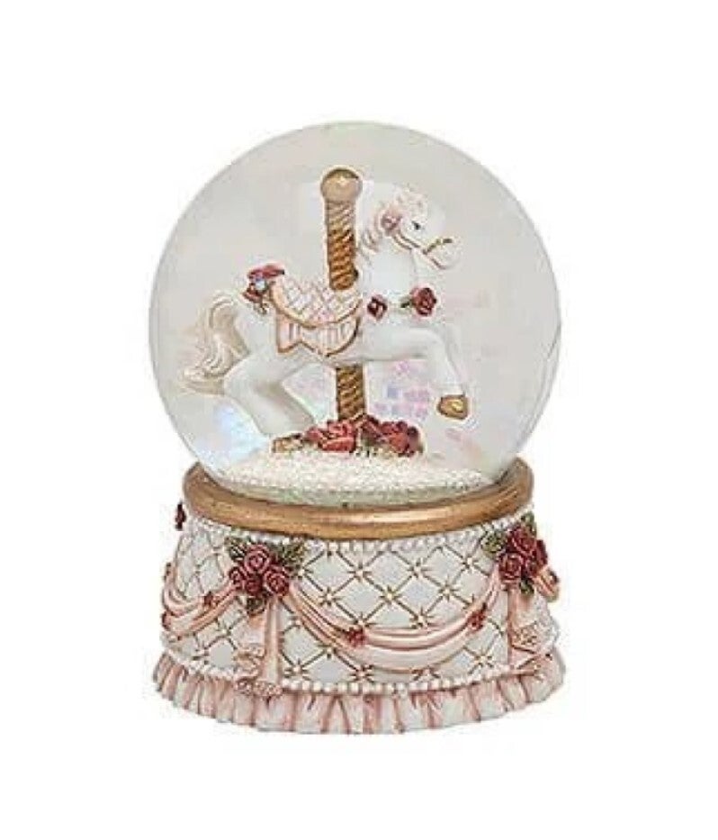 Deze leuke authentieke sneeuwbol van een hobbelpaard, geeft meteen een mooie kerstsfeer in huis. De sneeuwbol kent veel prachtige details. Zo is de mooie beige voet rijkelijk versierd met roze linten en rode roosjes. Deze sneeuwbol hobbelpaard heeft een stijlvolle uitstraling. Het hobbelpaardje draait om een rijkelijk versierde paal van een draaimolen. Dit geeft een romantische en vrolijke sfeer. Het doet ook denken aan de beroemde Spaanse rijschool in Wenen.