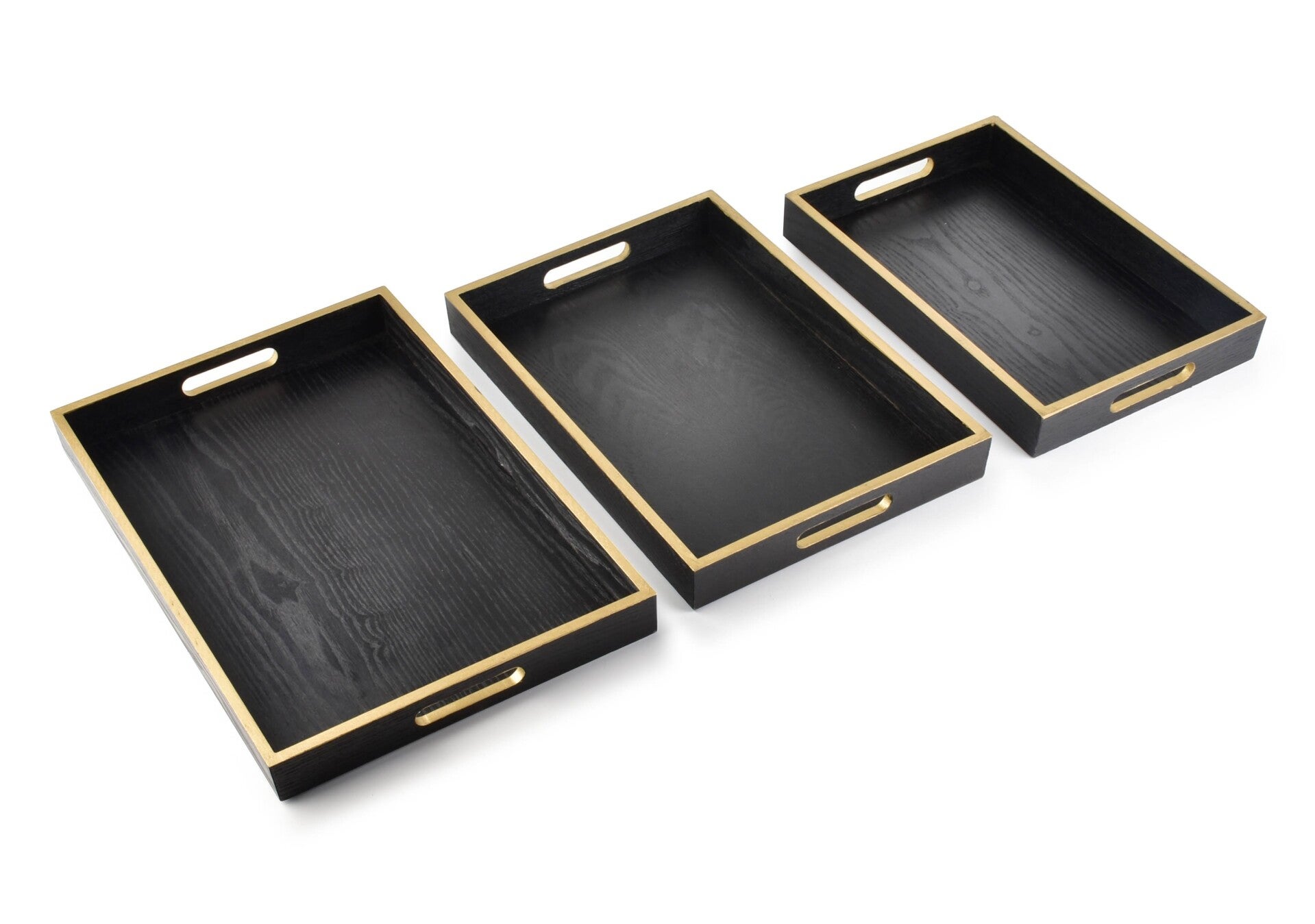 Breng een hotel chique uitstraling in je interieur met dit prachtige rechthoekige decoratieve dienblad in zwart met goud. De diepe zwarte kleur met zichtbare houtnerf en de stijlvolle gouden rand zorgen voor een luxe en elegante look, perfect voor een stijlvolle en sfeervolle setting.