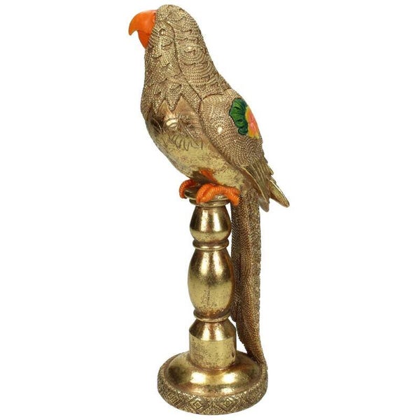 Geef jouw interieur een boost met dit mooie decoratieve beeld van een papegaai op een voet. Deze papegaai is bijzonder fraai gedecoreerd en kent fijne kleurrijke details in de kleuren goud, oranje en groen. Ook de voet heeft een mooi design in goud. Dit papegaai beeld verdient een mooi plekje in huis zoals op de dressoirkast, op een bijzettafeltje of op de schouw.