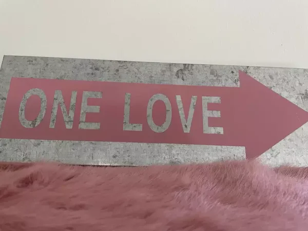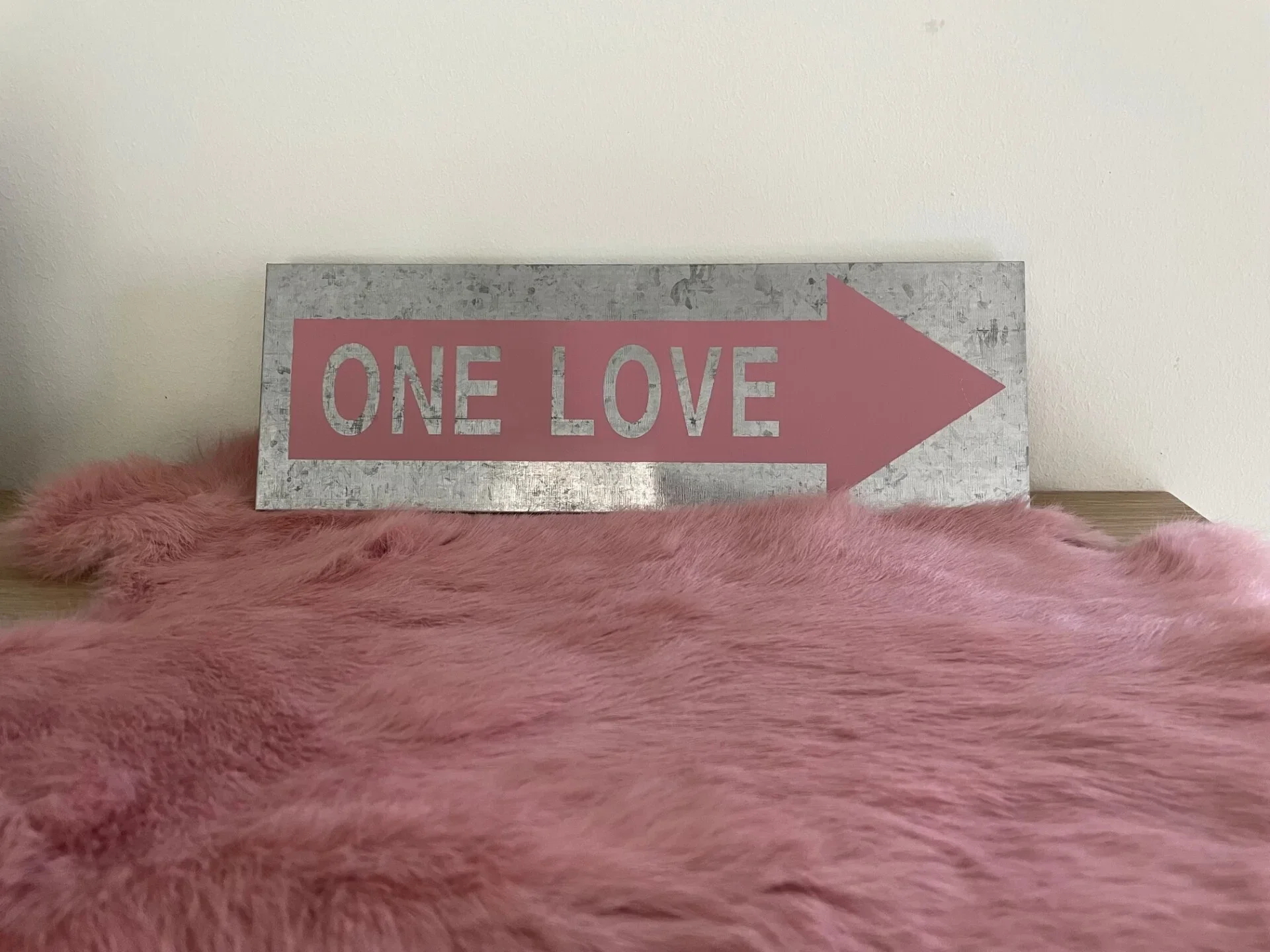 Leuk metalen bordje met een pijl en de tekst "one love".