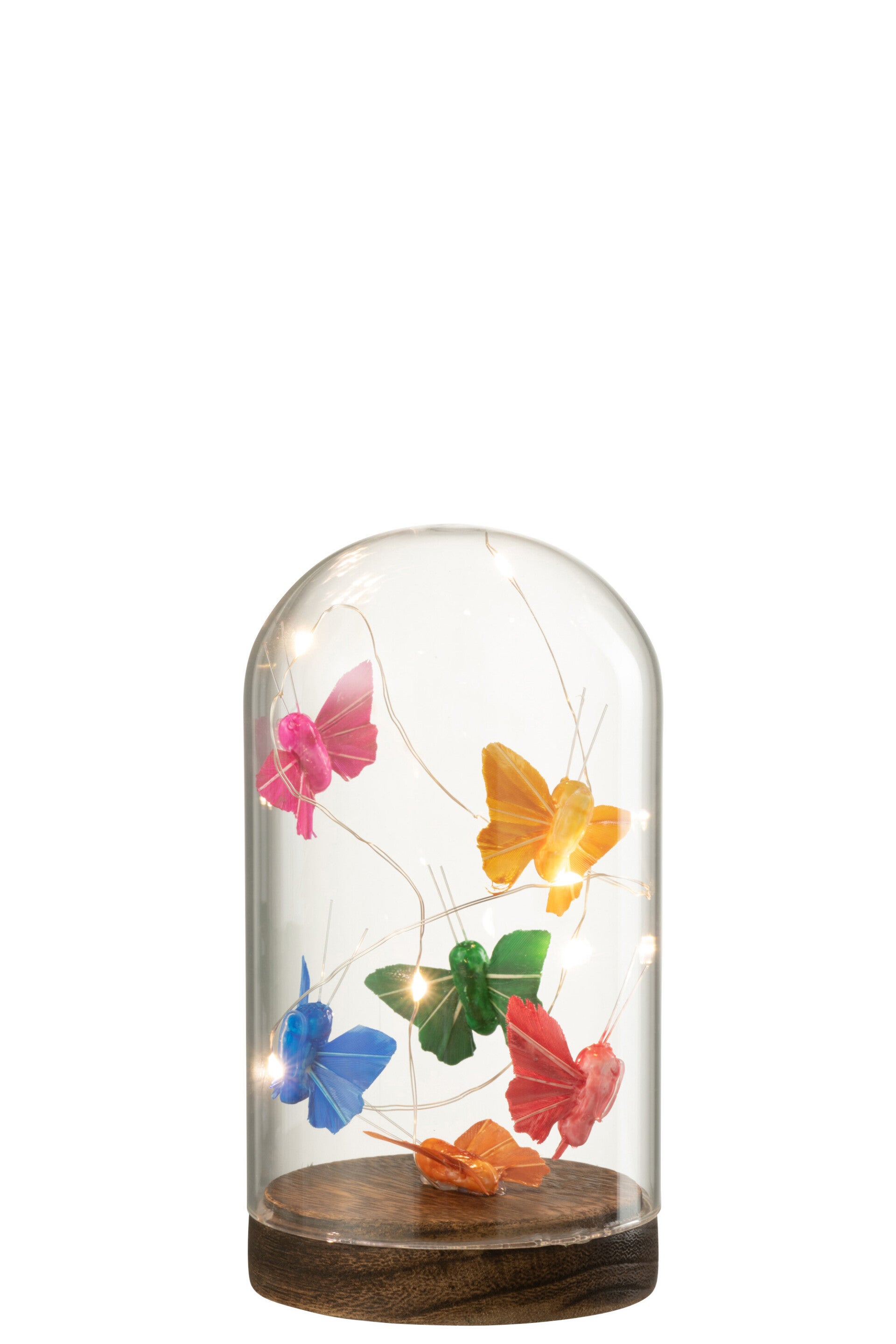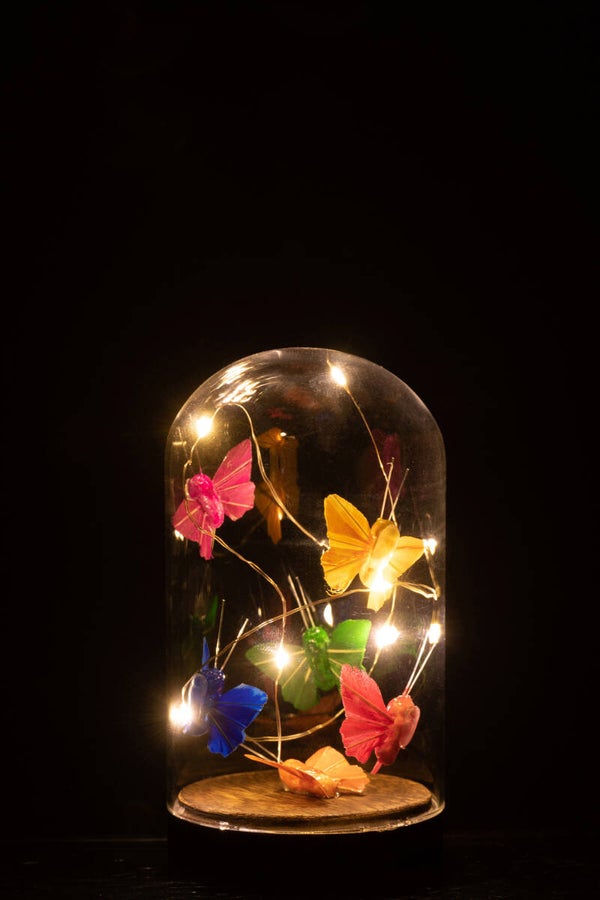 Breng een vleugje magie in je interieur met deze elegante stolp met vlinders en LED-verlichting van J-line. De delicate vlinders onder glas worden prachtig verlicht door warmwitte LED-lampjes, waardoor een dromerige en sfeervolle ambiance ontstaat.
