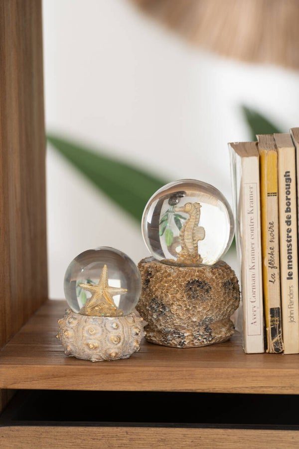 Deze waterbol is verkrijgbaar in drie uitvoeringen: een zeepaard, vis en zeester, elk met een unieke basis die perfect past binnen het maritieme thema. De kleine uitvoering heeft een afmeting van 8,5 cm hoog en een voet in de vorm van koraal, wat zorgt voor een authentieke oceaanstijl.