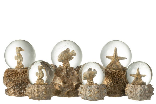 Deze waterbol is verkrijgbaar in drie uitvoeringen: een zeepaard, vis en zeester, elk met een unieke basis die perfect past binnen het maritieme thema. De grote uitvoering heeft een indrukwekkende afmeting van 13 cm hoog en is een stijlvolle blikvanger voor elk interieur.