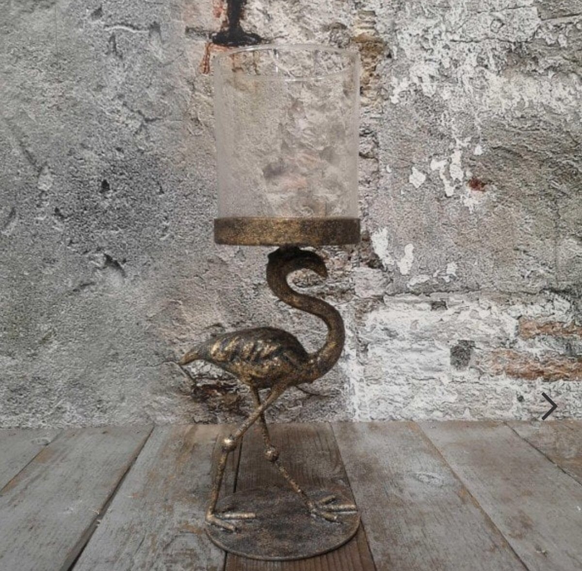Het windlicht heeft de vorm van een sierlijke flamingo met een sfeervol glas bovenop zijn kop. Plaats hierin moeiteloos een theelichtje of een stompkaars en geniet van de warme gloed die door het antiekgouden metaal wordt weerkaatst.