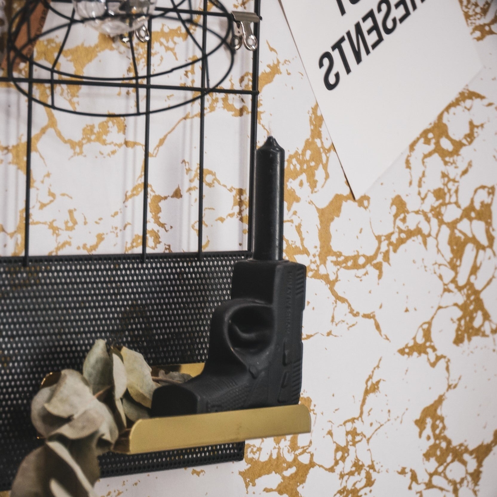 Geef je interieur een gedurfde en eigenzinnige touch met deze zwarte pistool kandelaar van Housevitamin. Met zijn opvallende ontwerp en stoere, matte afwerking is dit decoratiestuk een echte eyecatcher in elke ruimte. Perfect voor liefhebbers van unieke woonaccessoires en onconventionele statements.