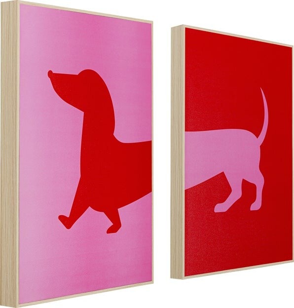 Geef je interieur een vrolijke en speelse touch met deze set van 2 kleurrijke schilderijen met een moderne teckelprint. De contrasterende kleuren roze en rood zorgen voor een stijlvolle en opvallende wanddecoratie, perfect voor hondenliefhebbers en liefhebbers van modern design.