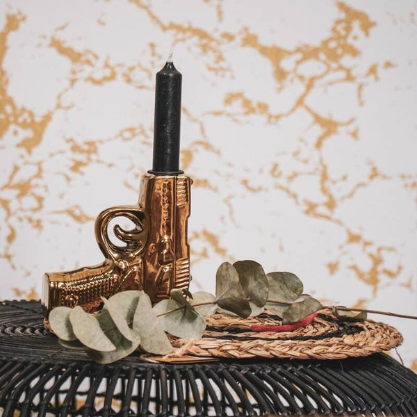 Gemaakt van duurzaam keramiek, heeft deze kandelaar een compact formaat van 12 cm x 12 cm, waardoor hij perfect is voor het toevoegen van een opvallend accent aan elke ruimte. Of je nu een liefhebber bent van onconventionele decoratie of gewoon op zoek bent naar een uniek gespreksonderwerp, deze gouden pistool kandelaar zal zeker de aandacht trekken.