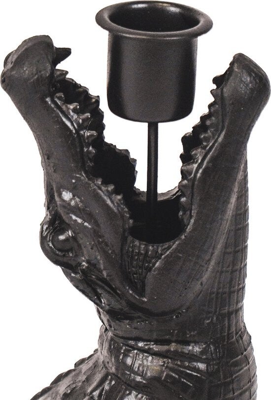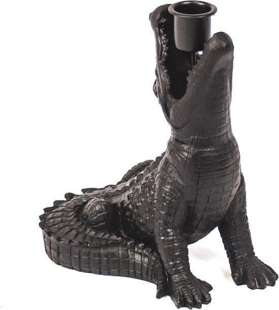Deze zwarte krokodillen kandelaar combineert stoer design met stijlvolle elegantie en is perfect voor wie van unieke woonaccessoires houdt.
