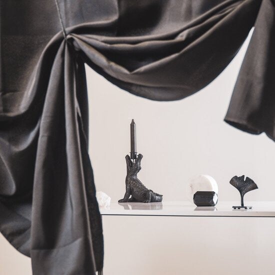 De krokodil houdt de kaarshouder stevig vast in zijn geopende bek, wat zorgt voor een speels en toch stijlvol effect. Dankzij de diepzwarte kleur past deze kandelaar moeiteloos in verschillende woonstijlen, van modern en industrieel tot bohemian en hotel chique. Ook zonder kaars is dit zwarte krokodillenbeeld een prachtige decoratieve toevoeging aan je interieur.