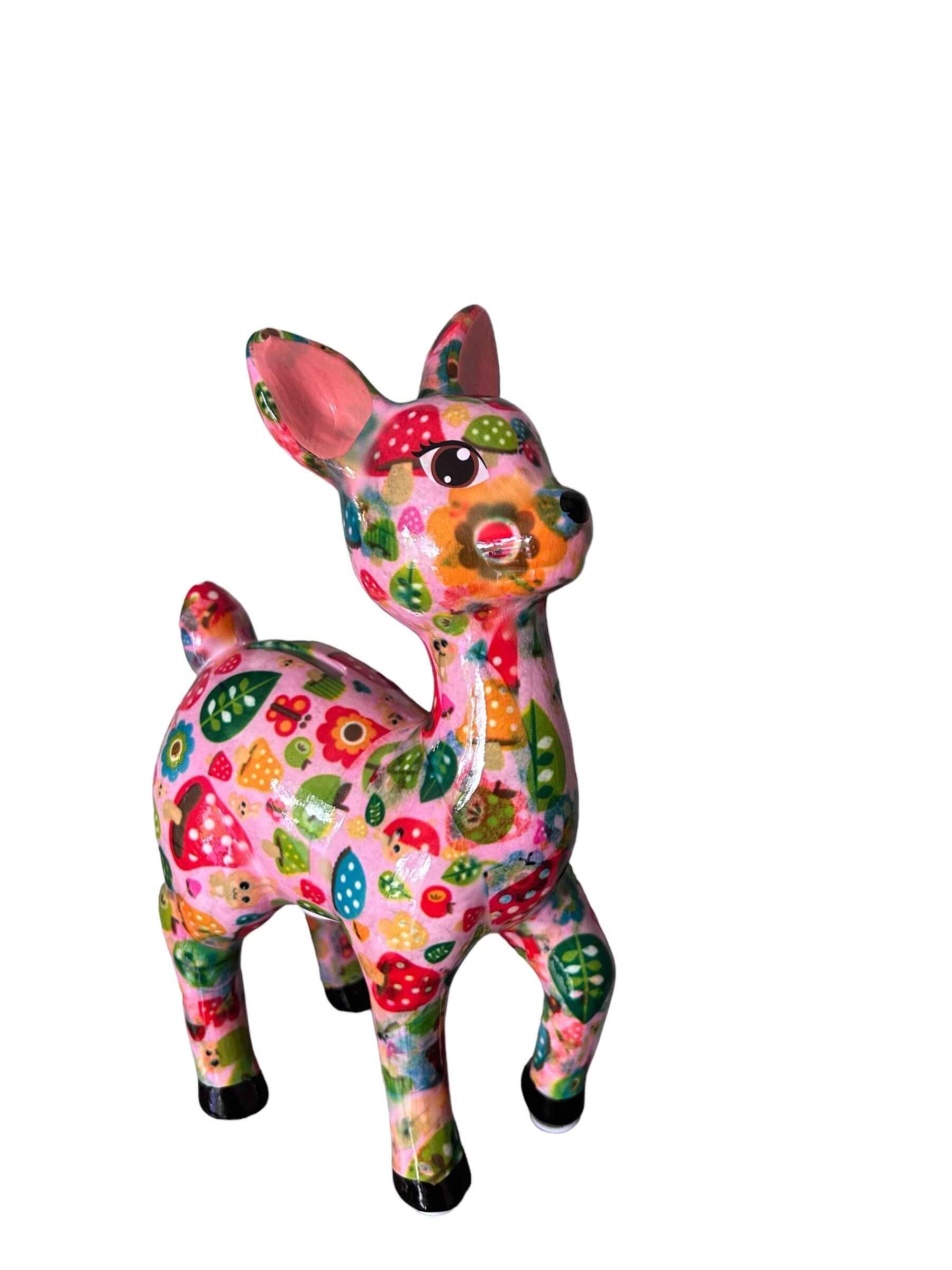Met Spaarpot Bambi Lilou van Pomme Pidou wordt sparen een vrolijke en kleurrijke ervaring! Dit schattige hertje in het "Pink Strawberry Fields"-design is met de hand beschilderd, waardoor elk exemplaar uniek is. De levendige kleuren en speelse patronen maken deze spaarpot bambi niet alleen praktisch, maar ook een prachtige decoratie voor je interieur.
