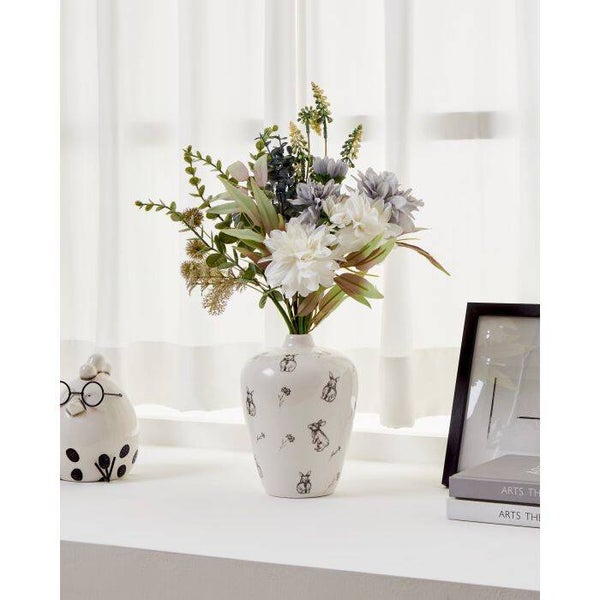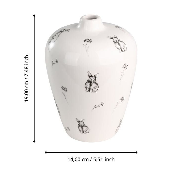 Breng een vleugje speelse elegantie in huis met deze prachtige keramieken vaas met konijnen. De subtiele zwart-witte illustraties van konijnen en bloemen geven deze vaas een charmante en landelijke uitstraling. Perfect als decoratiestuk of als stijlvolle vaas voor (droog)bloemen.