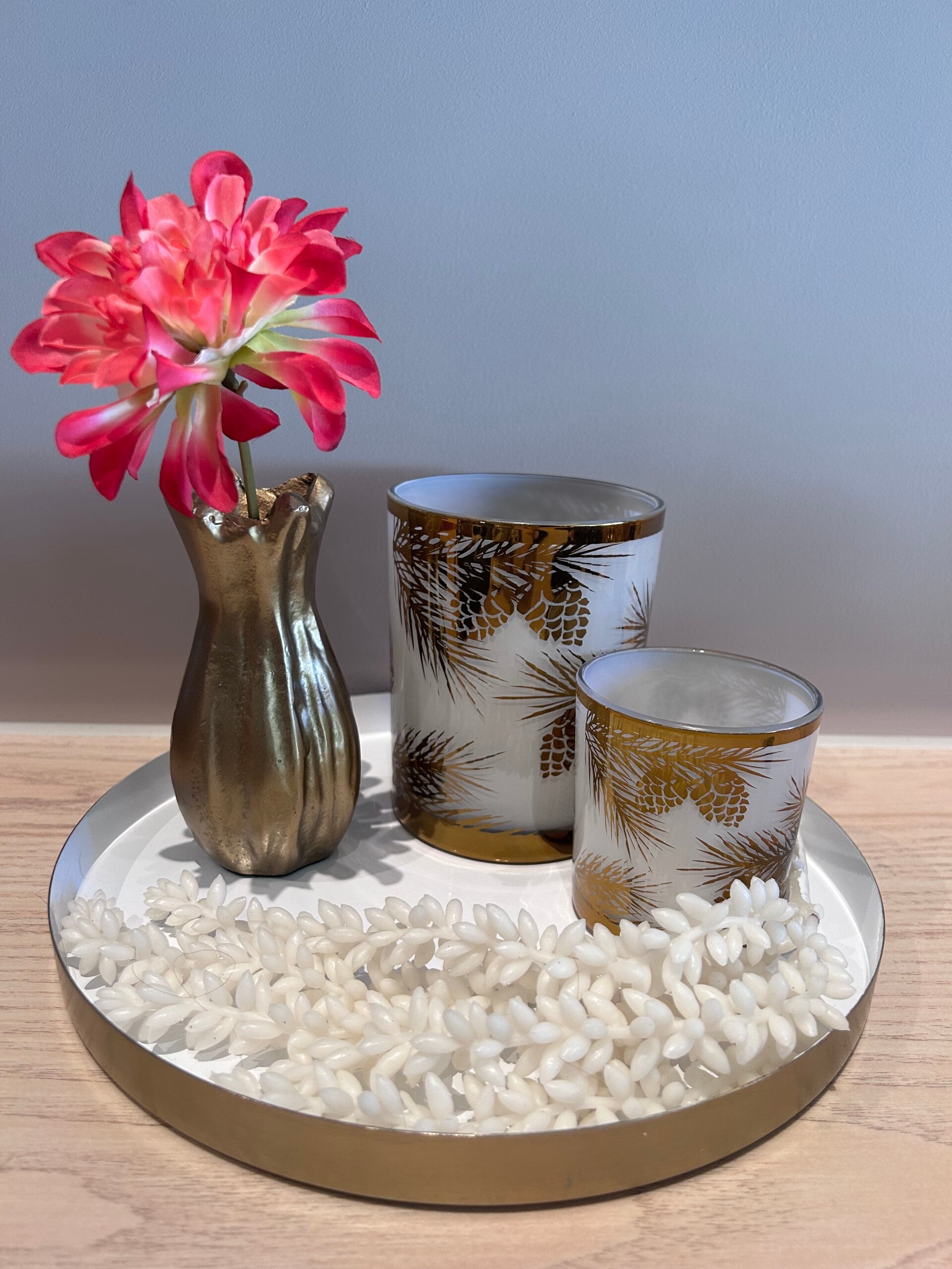 Tafeldecoratie Set | Wit | Goud | Theelichthouders Dennenappel | Vaasje met bloem