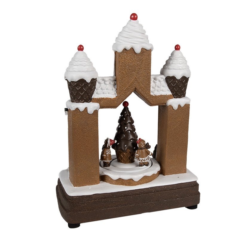 Haal de betoverende sfeer van een feestelijk marktplein in huis met dit prachtige Gingerbread Kersthuis van Clayre & Eef! Dit sfeervolle kersthuisje is voorzien van muziek en led-verlichting en uitgevoerd in een vrolijk gingerbread-thema. Met zijn warme kleuren, fonkelende lichtjes en sfeervolle melodieën, is dit 20x11x27cm decoratiestuk een perfecte toevoeging aan je kerstinterieur.