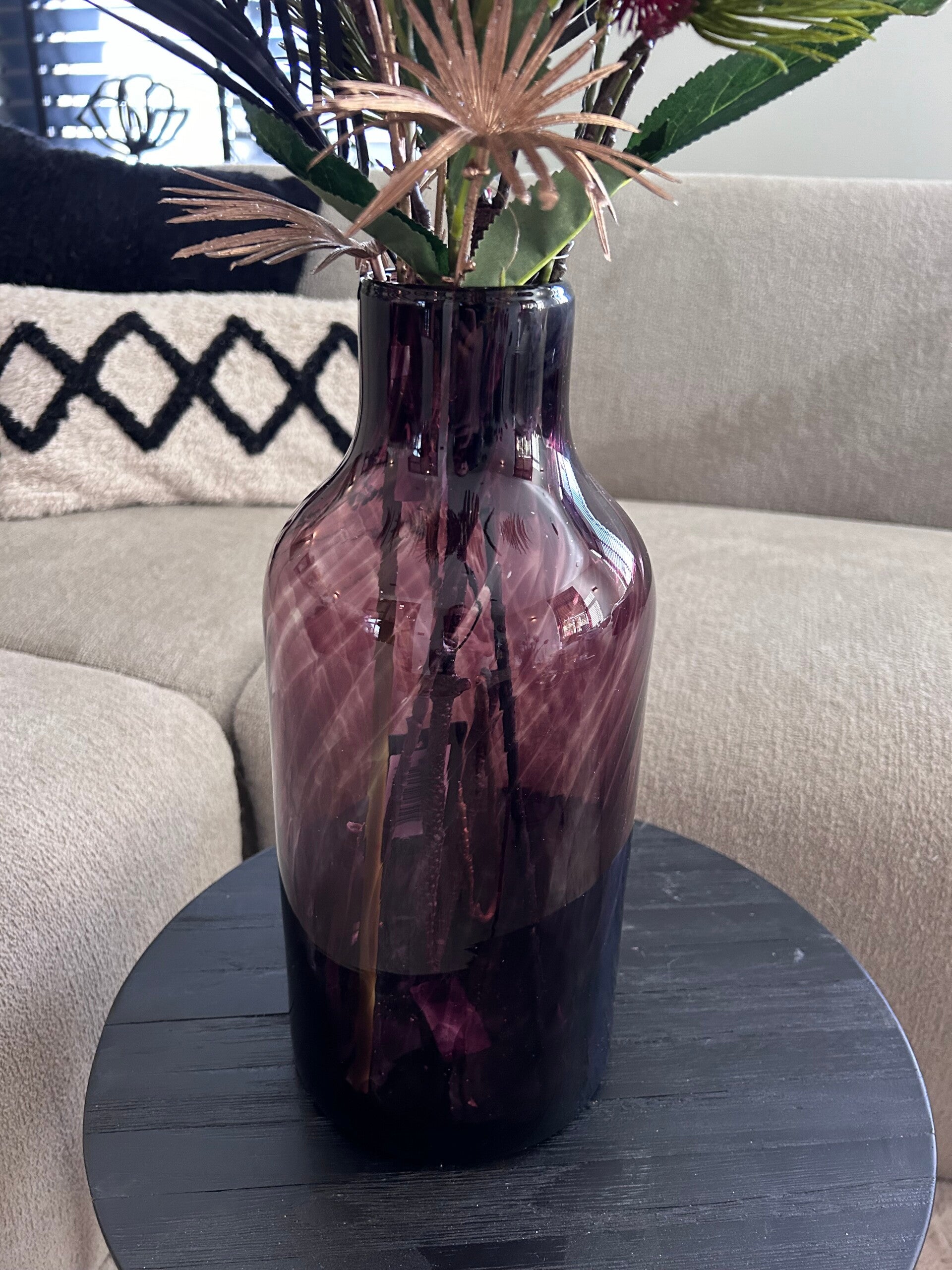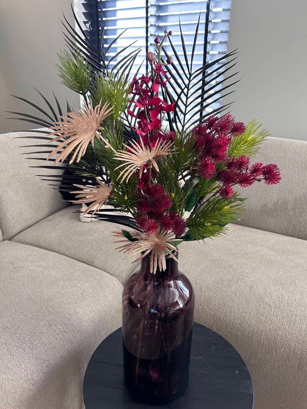 Prachtige burgundy glazen vaas inclusief luxe zijdenboeket / kerstboeket