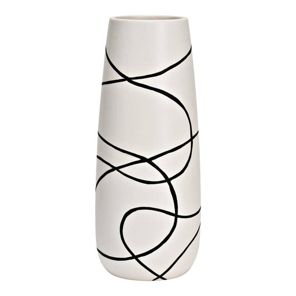 Deze elegante keramische vaas, met afmetingen van 10x10x25 cm, combineert een strak wit ontwerp met speelse zwarte lijnen voor een eigentijdse en stijlvolle look. Perfect om je favoriete bloemen te presenteren of als op zichzelf staand decoratiestuk.