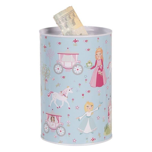 Laat de fantasie van je kind tot leven komen met deze betoverende blauwe prinsessenspaarpot! Versierd met vrolijke illustraties van prinsessen, eenhoorns, koetsen en kastelen, is deze spaarpot een magische toevoeging aan elke kinderkamer. Gemaakt van stevig blik en ontworpen om veilig munten en briefgeld te bewaren, combineert dit item functionaliteit met een sprookjesachtige uitstraling.