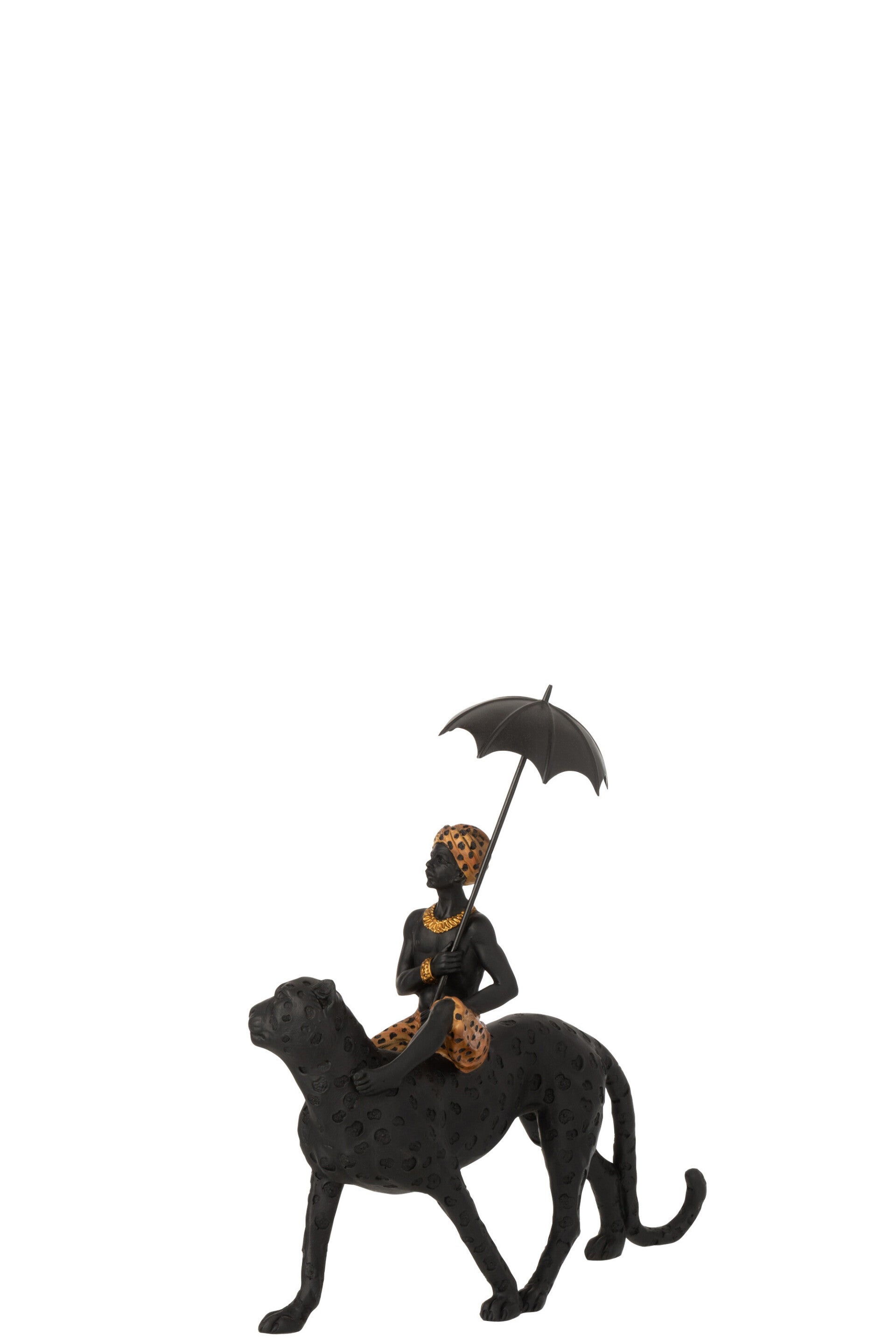 Voeg een vleugje exotische elegantie toe aan je interieur met dit unieke decoratieve beeld van J-line. Dit prachtige kunstwerk toont een sierlijke panter met daarop een jongen, gekleed in een stijlvol luipaardmotief en met een paraplu in de hand. Het beeld is gemaakt van duurzaam polyresin en heeft een indrukwekkende afmeting van 34x12x35 cm, wat het een echte blikvanger maakt.