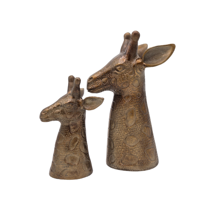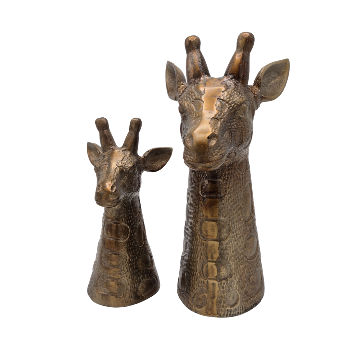 Op zoek naar een unieke en stijlvolle dierenaccessoire? Deze set van 2 giraffe hoofden in antiek goud voegt direct een exotische en luxe uitstraling toe aan je interieur. Gemaakt van hoogwaardig aluminium, combineren deze sculpturen een robuuste look met verfijnde details. Perfect als decoratief accent op een dressoir, boekenplank of vensterbank.