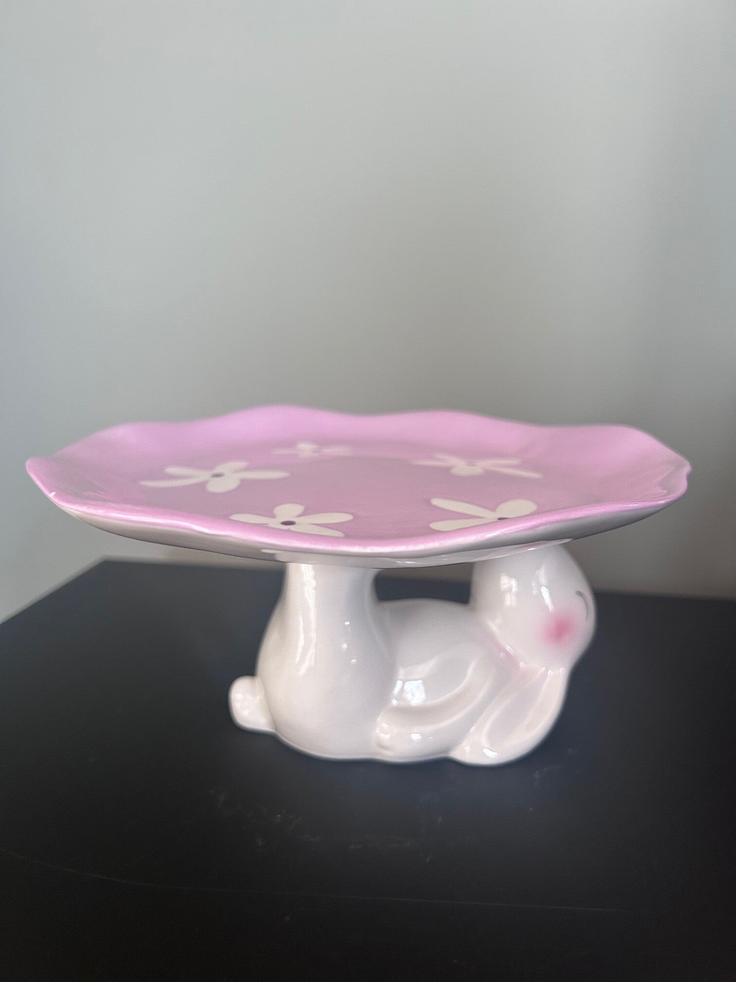 π£ Charmant paasdesign – Paarse schaal met een speels konijntje als voetstuk.