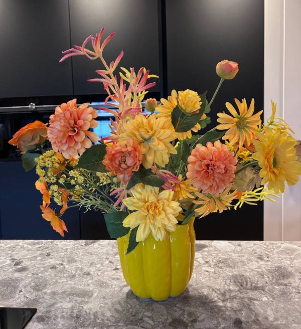 Het boeket bestaat uit maar liefst 18 hoogwaardige kunstbloemen in prachtige tinten van geel en oranje. Met een natuurlijke mix van bloemen, zoals tulpen, rozen, ranonkels, papavers, fruit spray, madeliefjes, cosmosbloemen, gerbera’s en gipskruid creëer je moeiteloos een warme en uitnodigende sfeer – zonder gedoe met water of onderhoud.